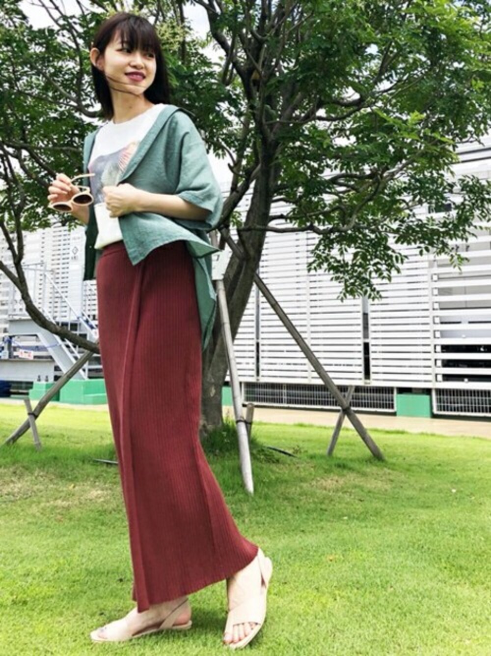 グリーン×テラコッタの華やかなカラーコーデ。プリントTとシャツでリラックスしつつ、女性らしいラインのスカートで上品に♪