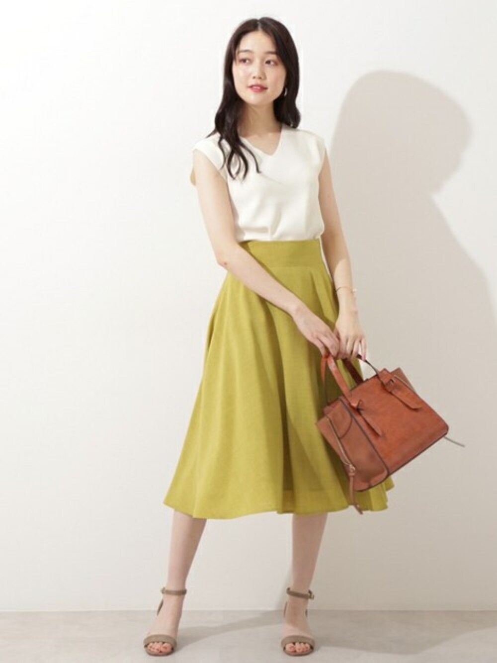 さっぱりとした総針ニットは、カラースカートを合わせて華やかに。女性らしく仕上がる華奢なストラップサンダルもポイントです♪