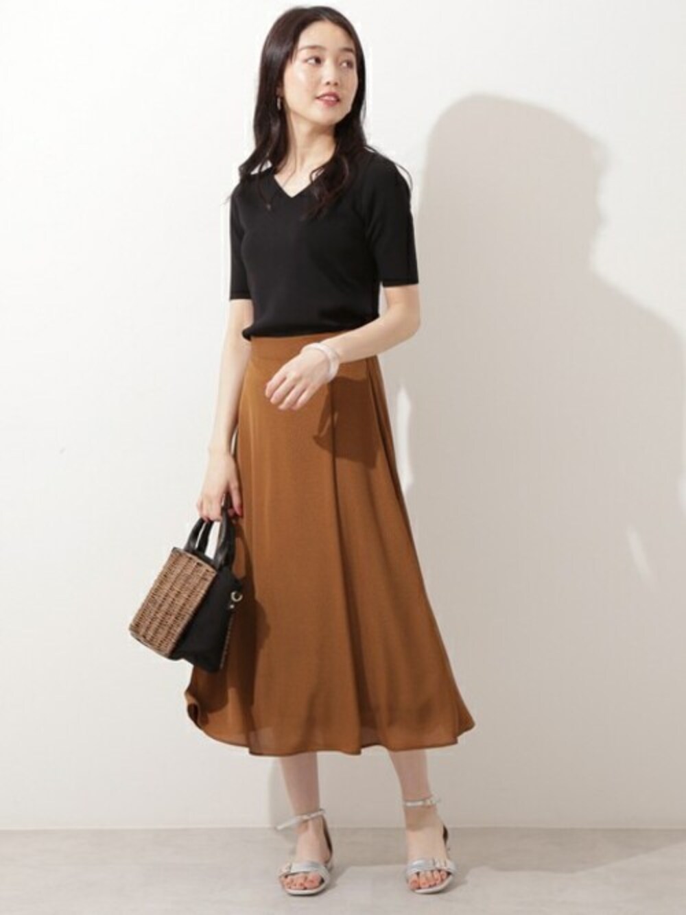 小さめのドット柄と巻きスカートのようなデザインが上品に着られるスカート。さらっとしたVネックニットと合わせれば夏にぴったりのスタイリングに。