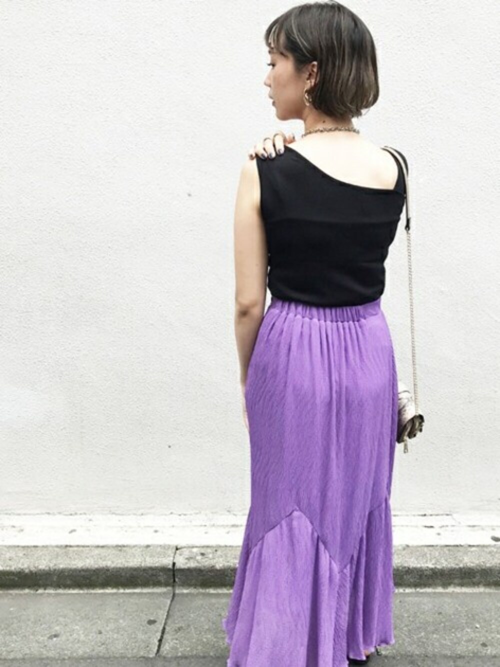2wayで使えるカットソーのアシメネックを後ろにしバックスタイルも綺麗に♪パープルでも強くなりすぎない品のある楊柳スカートを合わせてみました