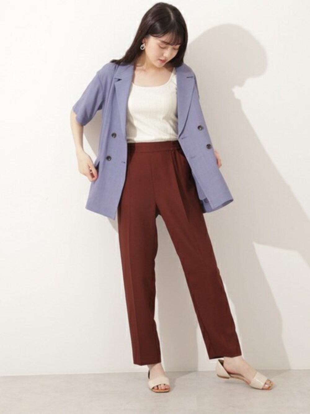 深いブラウンのパンツに明るいブルーのジャケットを合わせて、カラーを上手に使ったスタイリング。足元はフラットシューズで夏らしさを残して。