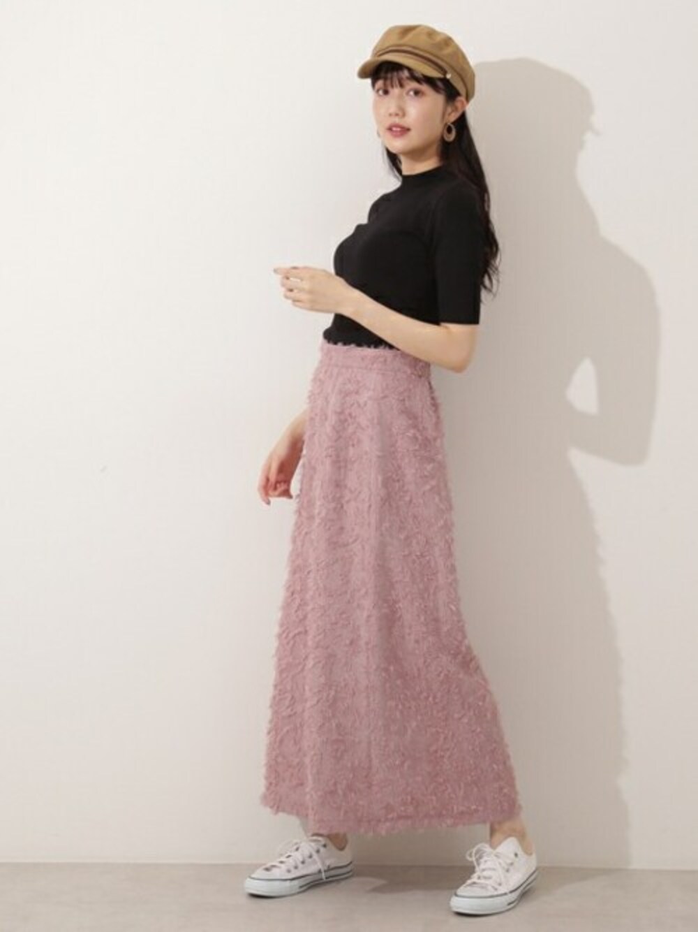 主役級のアイテムになること間違いなしのフェザースカート。トップスにはシンプルなデザインのものがおすすめです。スニーカーやキャスケットで外しても〇
