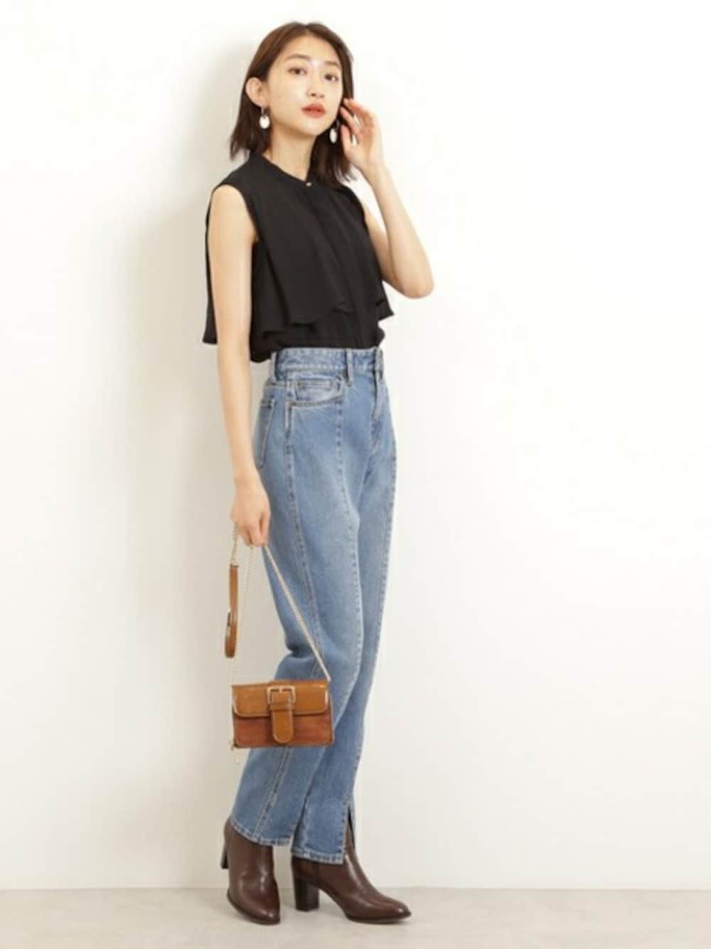 トップスとブーツはダークトーンでまとめ、全体的にカジュアルなハンサムスタイルに。ブラウスに施されたフリルデザインで、程よい女性らしさもきちんとアピール。