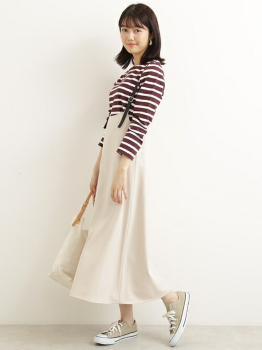 入荷するたびに即完売してしまうサスペンダー付スカートの追加生産が決定♪シーズンレスで着られる素材感は、ボルドーのボーダーカットソーと合わせて秋めいたコーディネートをしても可愛いです!