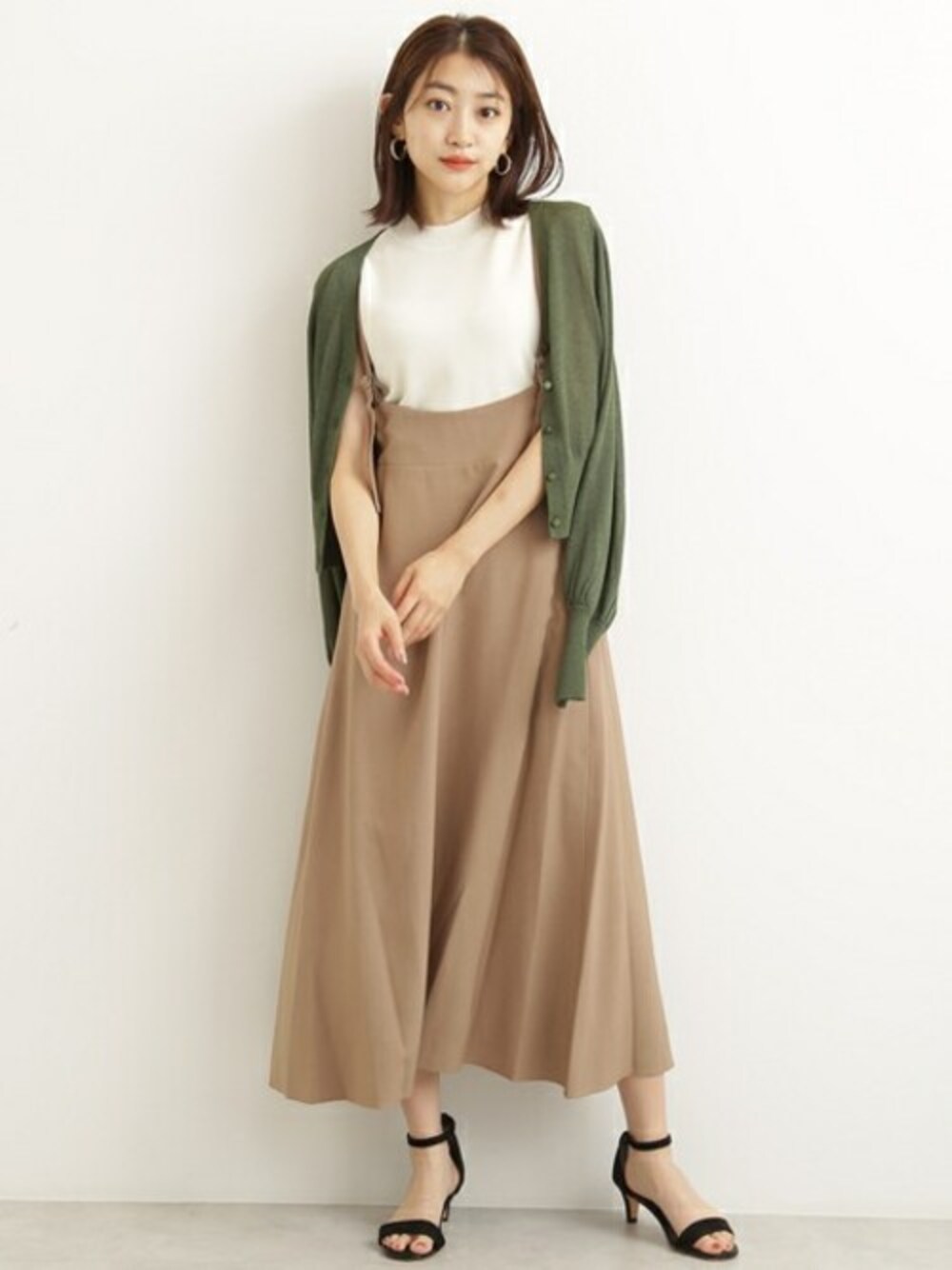 ドレープがたっぷりと入ったサスペンダー付スカートを主役に。ベーシックニットと重ねたシンプルなスタイルです。グリーンのカラーカーディガンがアクセントに。