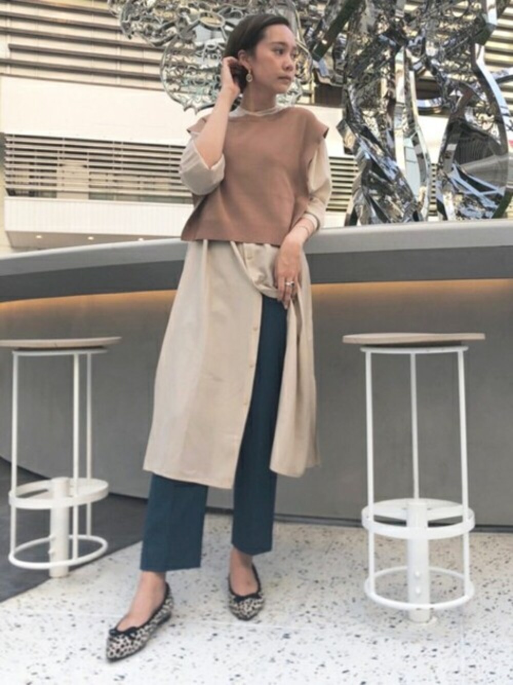 トレンドのレイヤードStyleを大人な秋の色合いでまとめました♪後ろからみたリボンがキュートでパンツスタイルも女性らしく着られます◎