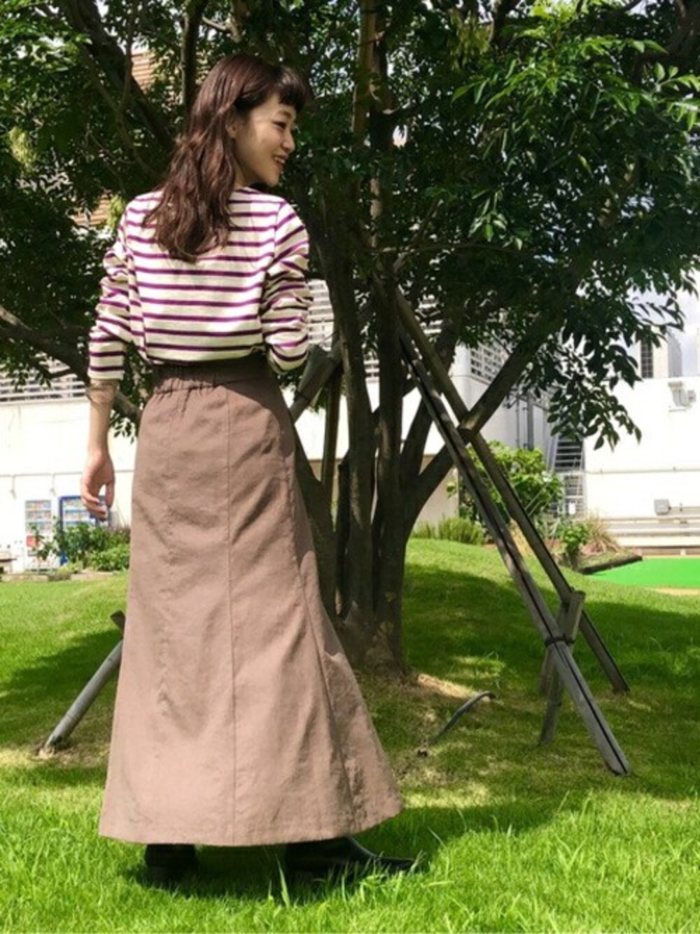 ピーチ素材で秋を先取りできるスカート。マーメイドラインで女性らしさを演出できるのでトップスや小物はシンプルにまとめると⌾
