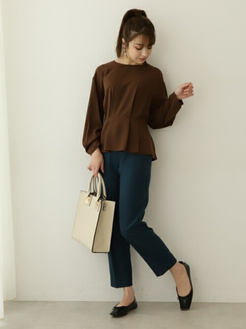 ウエストラインをシャープに見せてくれる、ペプラムブラウスを主役に。センタープレスパンツを合わせてスタイリッシュにまとめました。