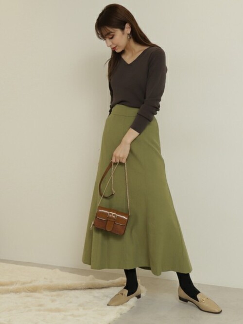 秋らしい発色のカラースカートに、N. 大人気の総針ニットを合わせて。ゴールドが効いたチェーンバッグやビット付きローファー足して、大人カジュアルな印象に仕上げました。