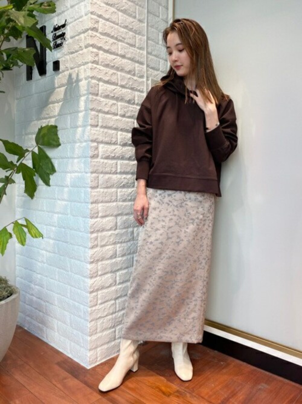 女性らしいタイトなシルエットに、高級感のあるジャガード素材が上品な雰囲気を演出してくれます♪ショート丈パーカーを合わせてバランス良く大人カジュアルコーデに◎