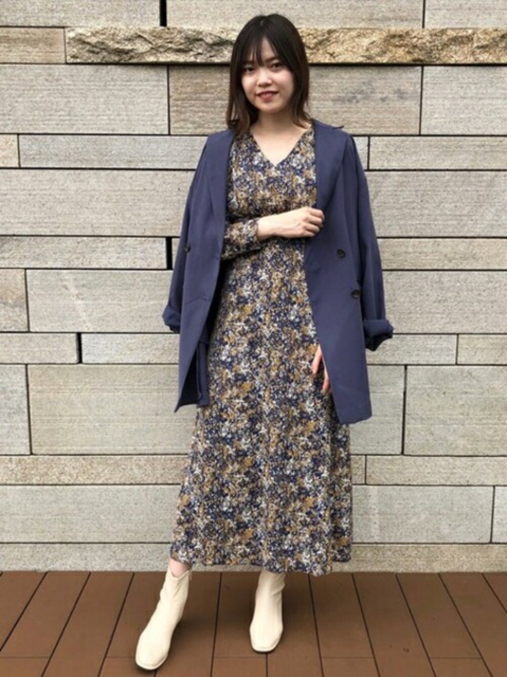 秋らしく深みのあるブルーでまとめたコーデにエクリュのショートブーツを合わせました!Vネックとウエストマークがポイントのワンピースは1枚でもスッキリと見せてくれます☺︎︎