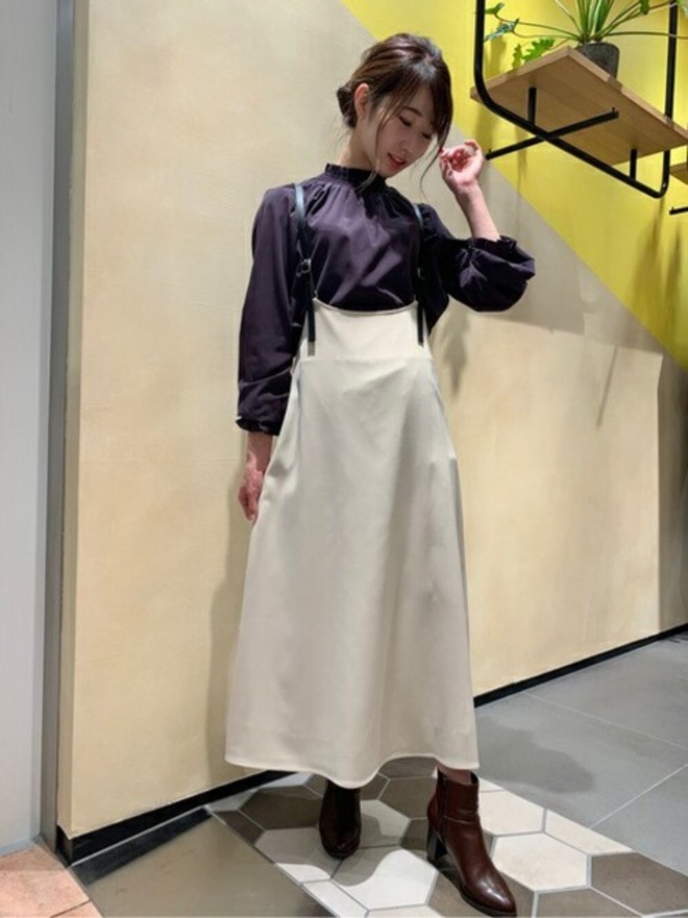 シンプルで大人っぽく着られるサスペンダー付きスカートと、秋らしいカラーブラウスの組み合わせ。インナーによってロングシーズン使っていただけるので着回し抜群◎
