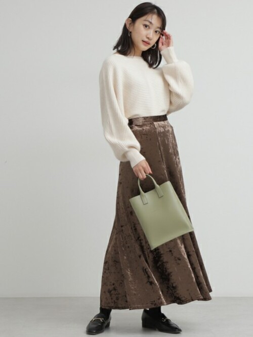 ボトムスを選ばないシンプルなアゼ編みニットに、インパクトのあるベロア素材のスカートをセレクト。トップスをIN×マキシスカートで足長効果も期待できる着こなしです。