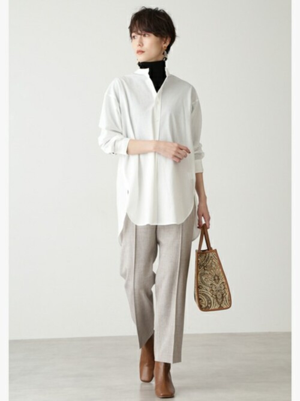 スカート、パンツとも相性がよく、裾をアウトして縦ラインが引き立つコーディネートがお勧めです。