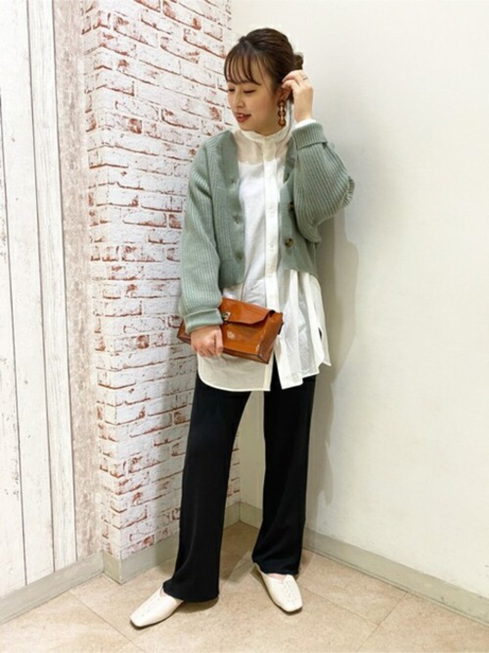 ざっくりと編み上げたカーディガンとヒップが隠れる着丈のシャツ、ゆったりとした着心地のリブパンツで大人楽チンスタイル。テラコッタカラーのバッグでコーディネートのアクセントに。