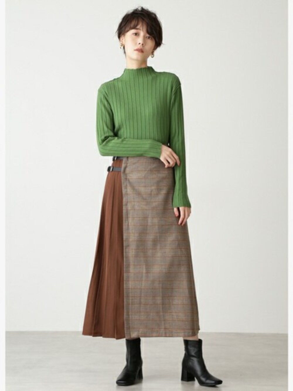 デザイン性のあるバイカラースカートに、グリーンカラーのニットで華やかさをプラス。寒くなってきたら、ブラックやホワイトのアウターを重ねても様になります。