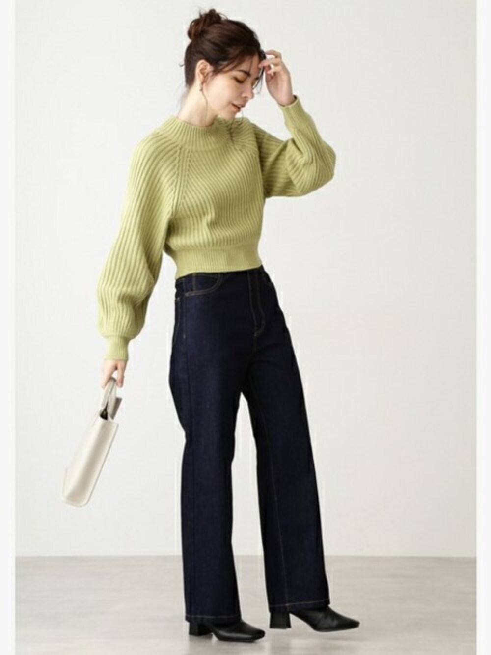 ウエストを絞ったショート丈のニットに、ハイウエストのデニムを組み合わせてスタイルUP。今季N.でおすすめのミントグリーンは、今年らしくも挑戦しやすい色味となっています。