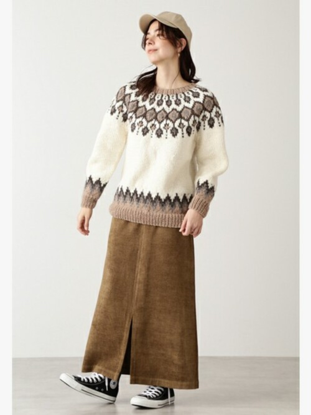 ノルディック柄のニット×モールジャガード素材スカートで、冬らしさ溢れるコーディネートに。小物はキャップとスニーカーで外してカジュアルダウン。