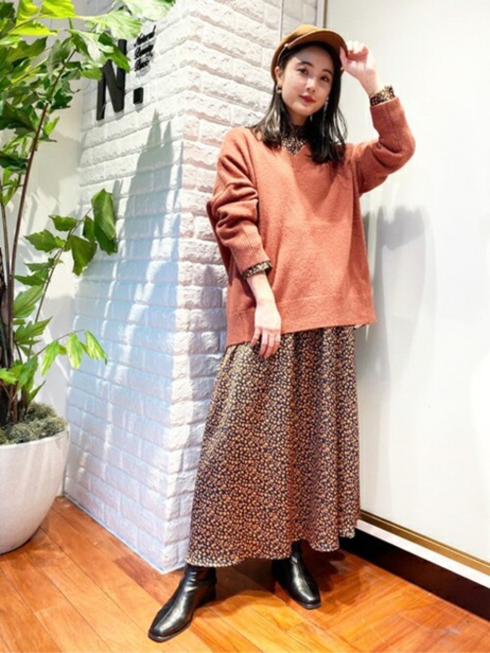 ワンピースとニットのレイヤードスタイルで今年っぽく◎1枚着でも光沢感があり、ウエスト切り替えでスタイル良く見え女性らしく♪