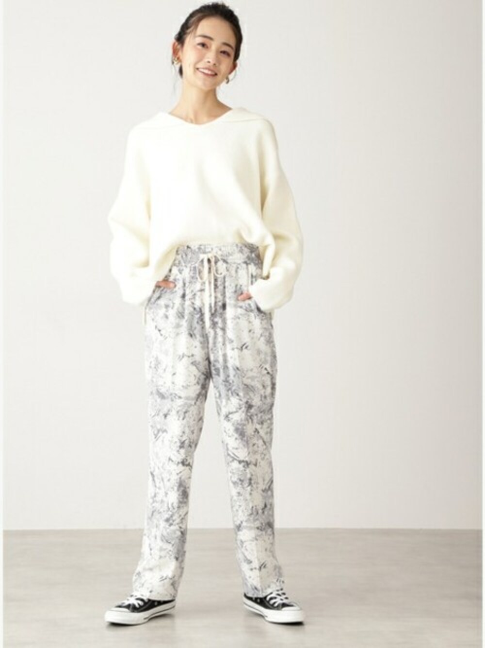 周りと差をつけたおしゃれを楽しみたいなら、セーラーカラーニットがおすすめです。プリントの入ったイージーパンツと合わせて、とことんカジュアルな着こなしに。