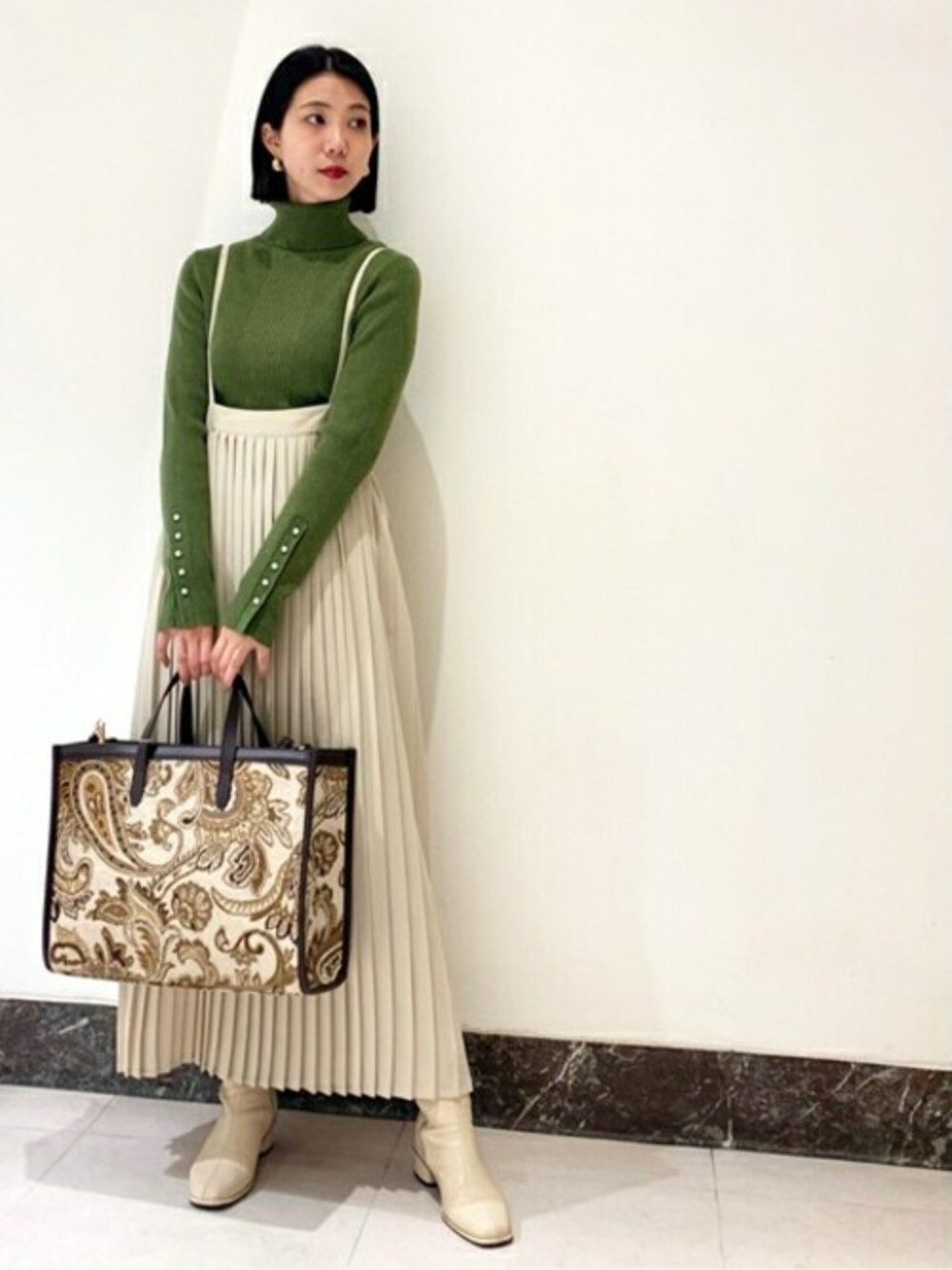 パール釦のニットはコンパクトなシルエットでもちゃんと暖かい素材で1枚で着たり、レイヤードアイテムとしてインナーにしても使えます♡プリーツのキャミワンピは細めの肩紐で大人も着やすいデザインです☺︎