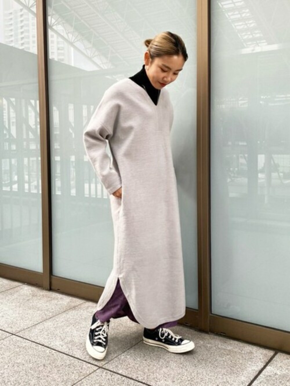 カフタンネックワンピースは1枚でサラッと着るのはもちろん、レイヤードもしやすいワンピースです。スカートでの合わせも、パンツをINするのも可愛いですね◎