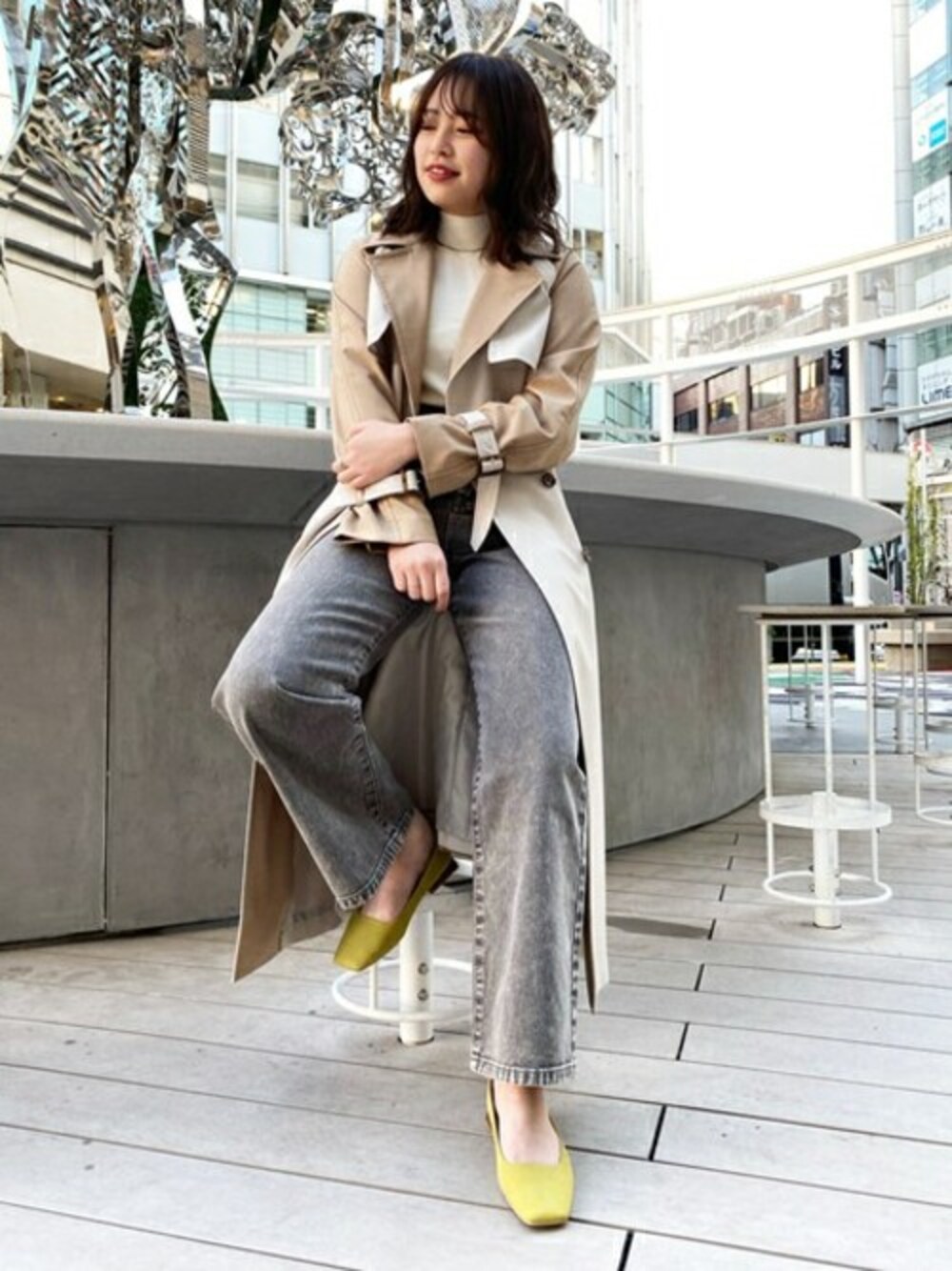 トレンドに左右されないベーシックデザインのトレンチコートを主役にデニムとパンプスを合わせカジュアルに仕上げました♪ バックスタイルも共布ベルトを結べば女性らしいスタイルに◎