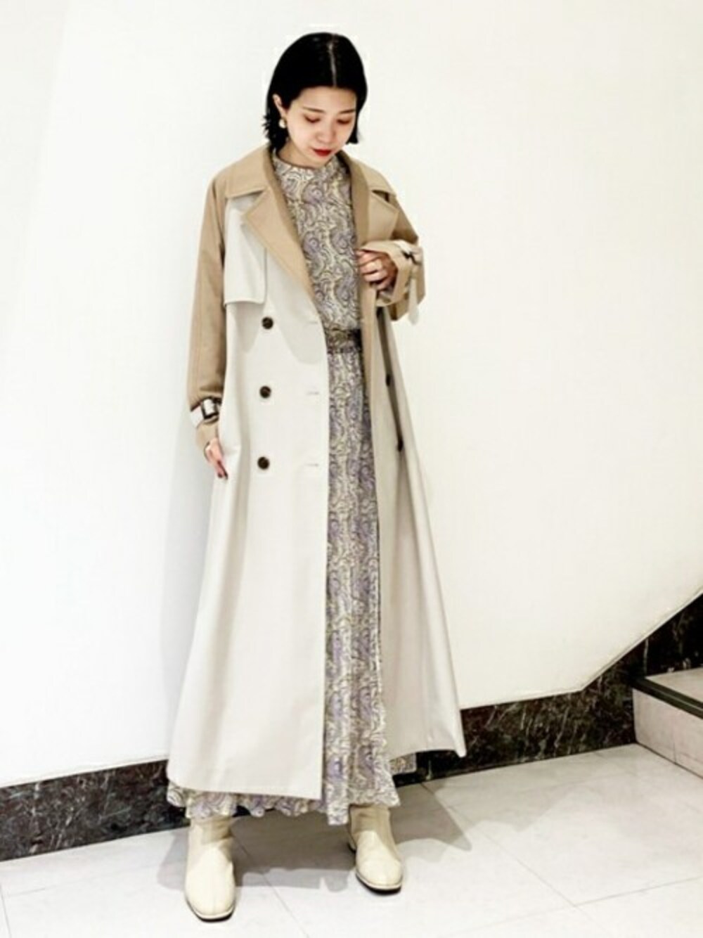 バイカラーのデザインが可愛いトレンチコートは着丈が長く身幅はスッキリとしているので全体がすらっとして見えます!マジョリカプリーツのワンピースは軽やかでふんわりとした表情感が出て、ボリューム袖もポイントとなるので1枚で十分可愛いです♡