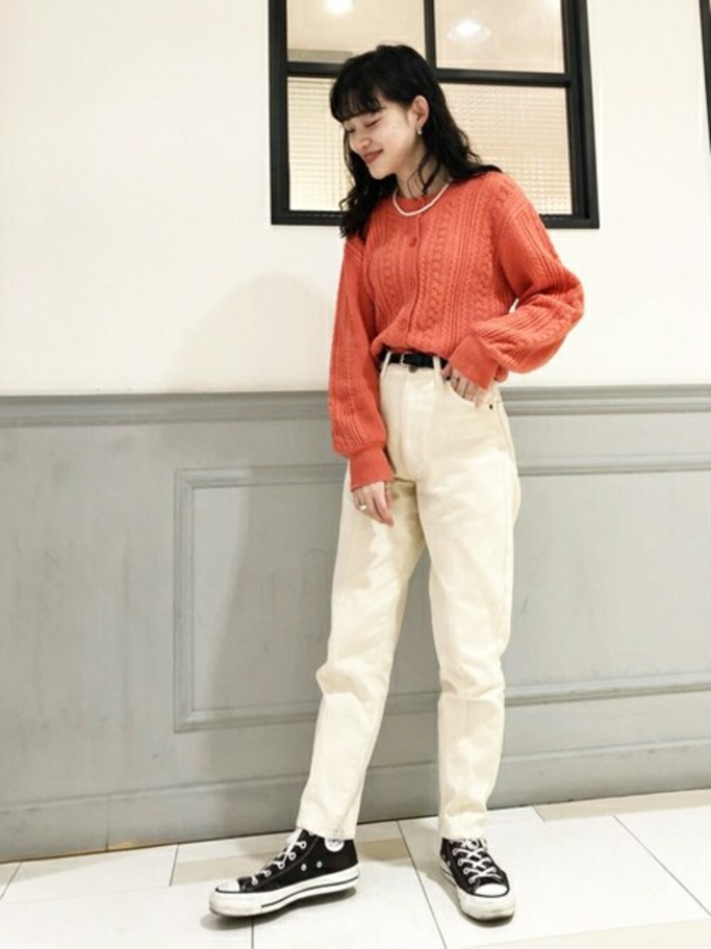 春らしいパキッとしたオレンジのカーディガンは柄編みでシンプルなデニム×スニーカーでも華やかな印象に⌾カジュアルコーデのアクセントにパールネックレスもこの春おすすめです♡