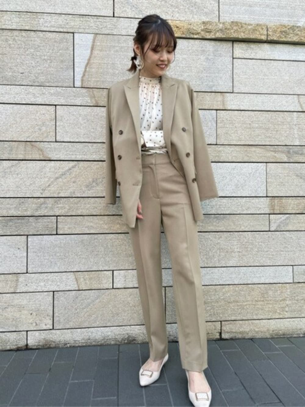 マニッシュな雰囲気のセットアップに可愛らしいランダムドットのブラウスを合わせました♡体のラインを拾いすぎずにスッキリと見せてくれるセンタープレスのパンツは素材感が柔らかく着心地の良い一枚です◎かっちりとしたジャケットは肩がけで春らしく軽やかに羽織るのがオススメです♩