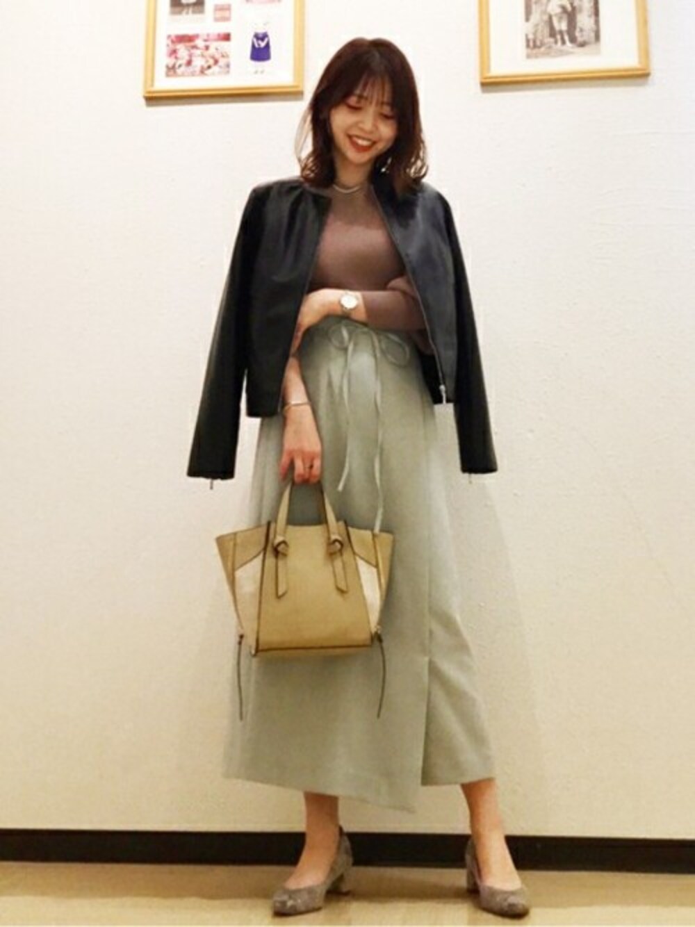 ミントグリーンで春らしさを先取り! ライダースで合わせる事で、大人っぽい印象に♪