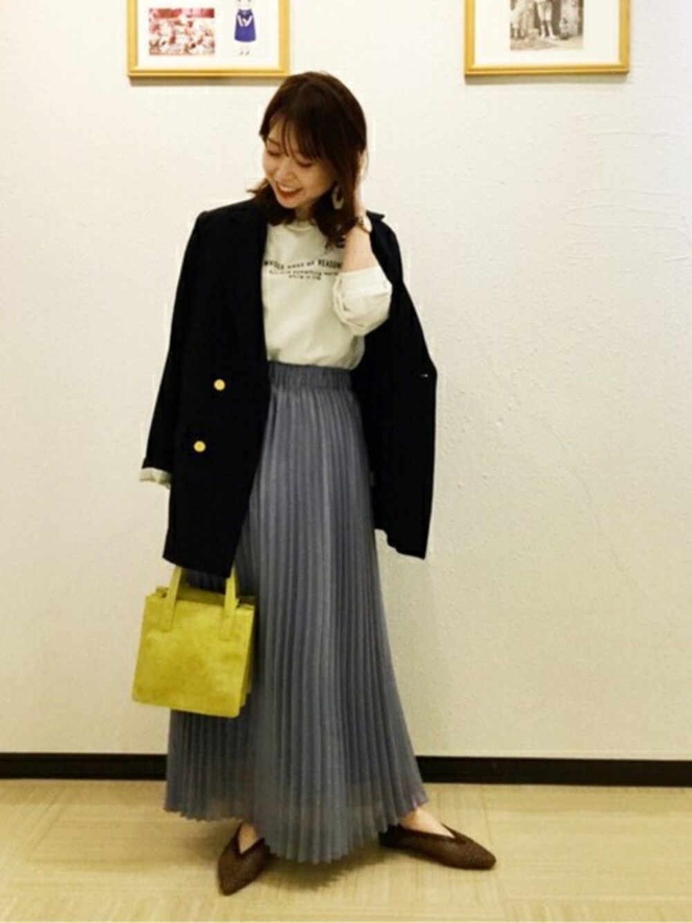 春らしいブルーのプリーツスカートは、光沢があり動きが綺麗に出ます♪ ロゴTと合わせる事で大人カジュアルな印象に。 ジャケットは袖の裏地がストライプになっていて、爽やかな雰囲気を演出してくれます!