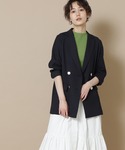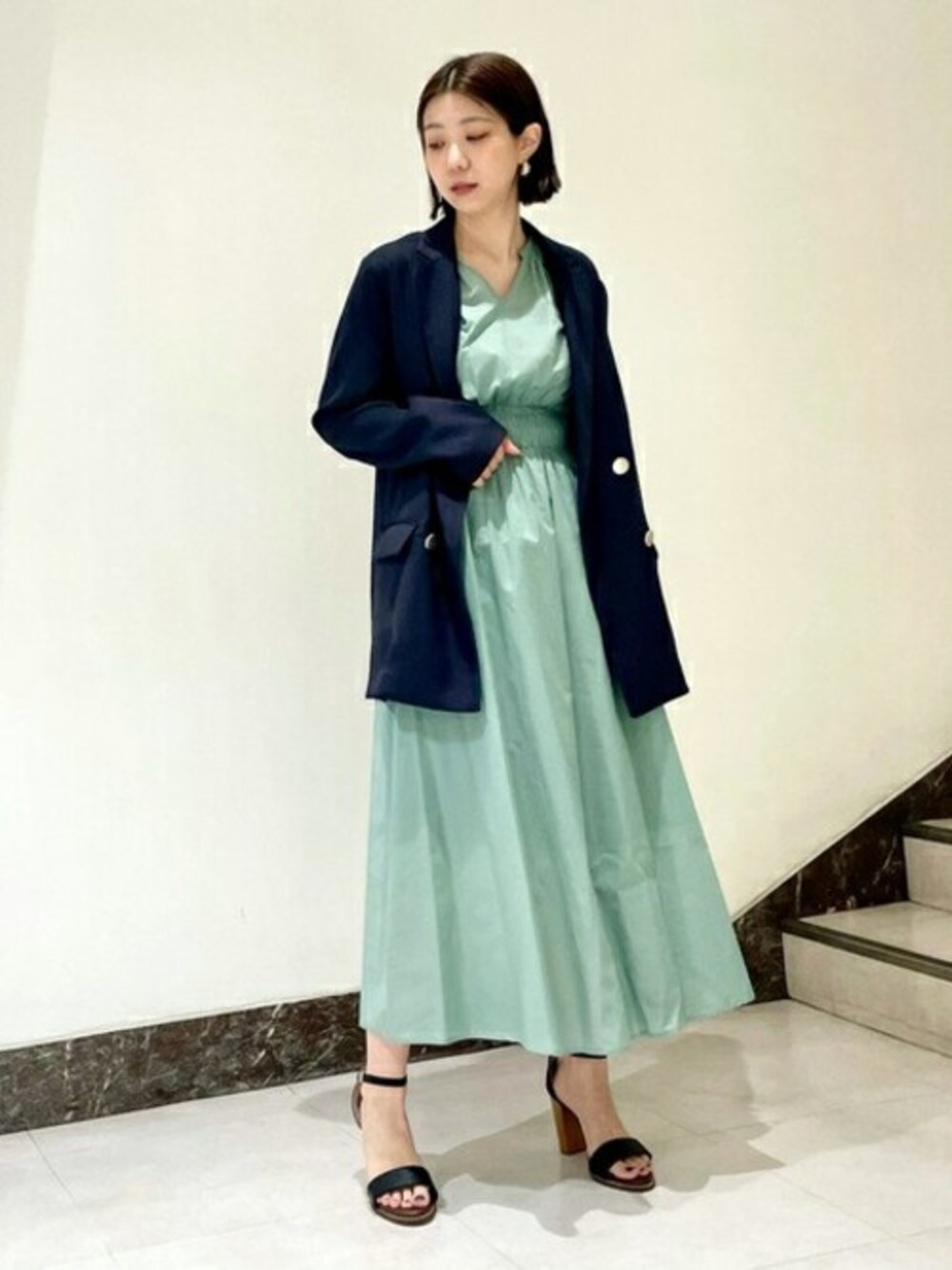 毎年人気のシャーリングワンピースは今年はジャケットで合わせて着ても可愛いです! 首元がVネックで甘くなりすぎないので大人可愛いスタイリングが1枚で完成します。