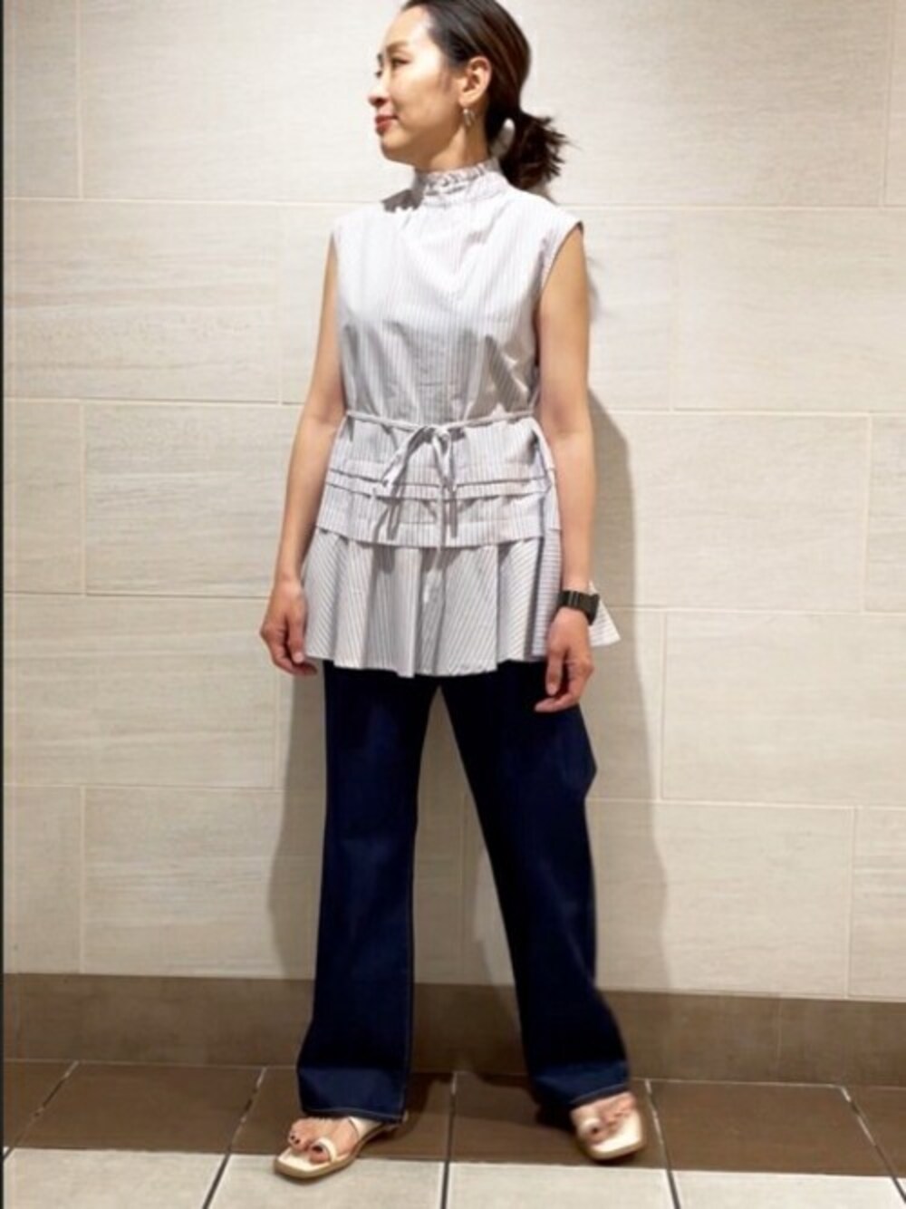 フリルネックでフェミニンな印象のペプラムブラウスです。 腰周りが隠れ、リボンでウエストマークするとスタイルアップできます‼︎ ハイウエストなデニムと合わせ、大人カジュアルにバランスよく決まります♫