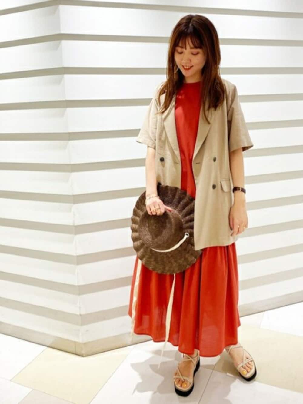カラーのコットンワンピースと半袖ジャケットで大人カジュアルな夏スタイル。ティアードデザインが程よいボリュームを出してくれるワンピースはシルエットの綺麗さと、着心地の良さがこれから夏に大活躍です。
