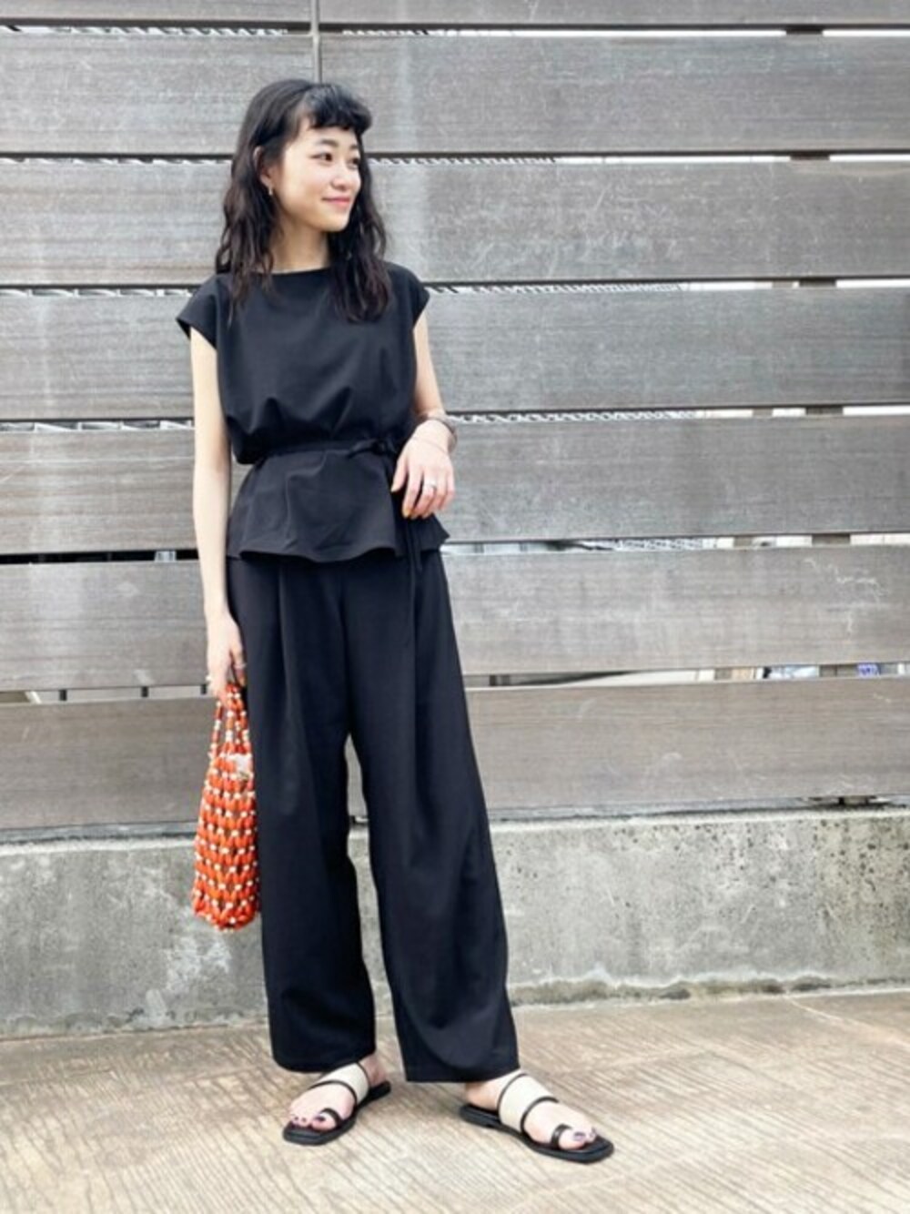 ブラックでキレイめな印象のセットアップ。ヘアスタイルや小物使いでカジュアルに見せたり、着回し万能なアイテムです♪