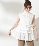 チュニック丈で首元とウエストデザインが華やかなブラウス。ウエストリボンを取って着るとふんわりフレアなシルエットが可愛いです♪ キレイめなパンツスタイルで通勤にも⌾