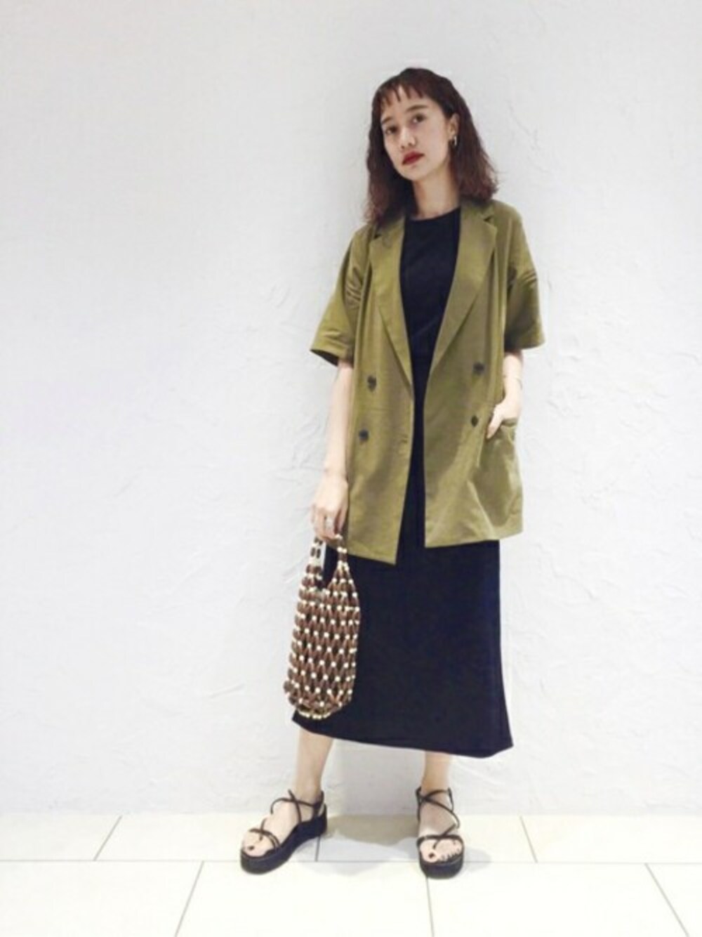 半袖のジャケットは、リラックス感のあるゆったりとしたシルエットです♪ スッキリとしたリブのワンピースを合わせて、メリハリのある大人カジュアルなコーディネートです!