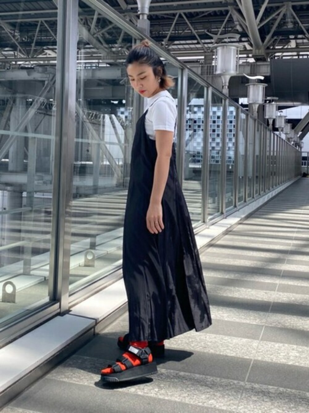 キャミワンピースの着回しです。カジュアルにそして子供っぽくならないようにしてみました。光に当たると光沢感もでるので夏の黒もオススメです◎