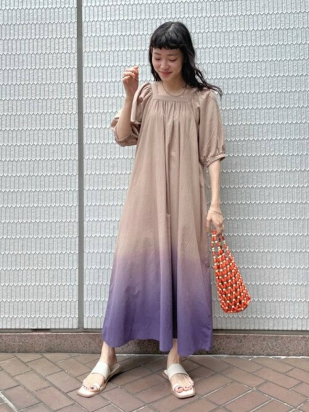 ゆったりしたラインにグラデーションが映えるコットン素材のワンピース。着るだけで気分の上がる華やかな1枚です!背中のラインも綺麗に見せてくれるデザインなのでショートヘアやアップスタイルとも相性抜群⌾