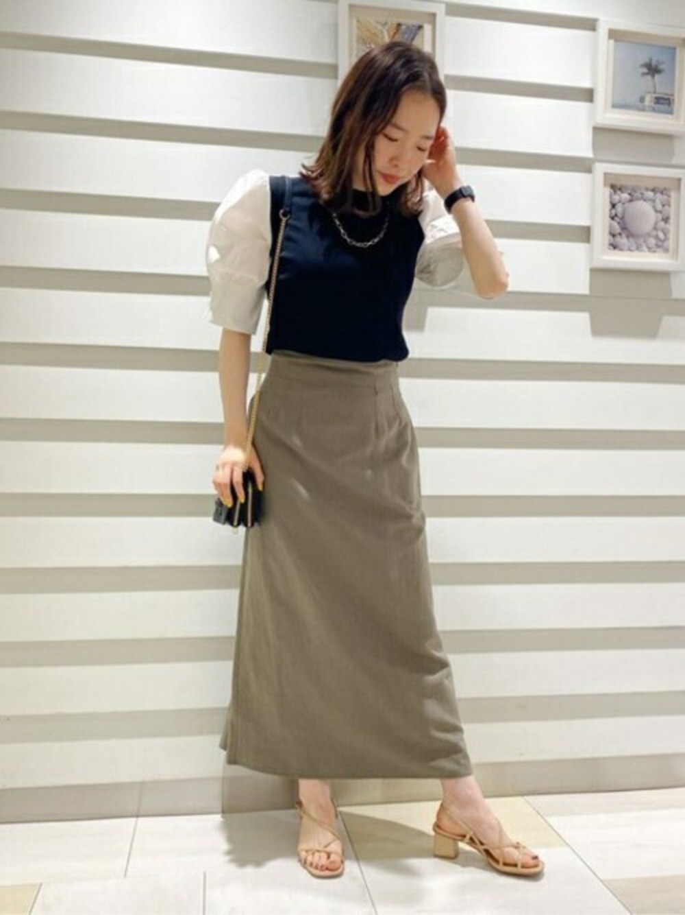 ボリュームのある袖で女性らしいシルエットに◎ ニットの素材もサラッとしていて夏も着心地抜群です♪ こちらのドッキングニットはON.OFF着回ししやすいアイテム!パンツスタイルに合わせてあげても素敵だと思います◎ 今回合わせている麻のスカートも後ろがレースアップになっていているのがポイント! シルエットも広がりすぎないのでスッキリ合わせられます。