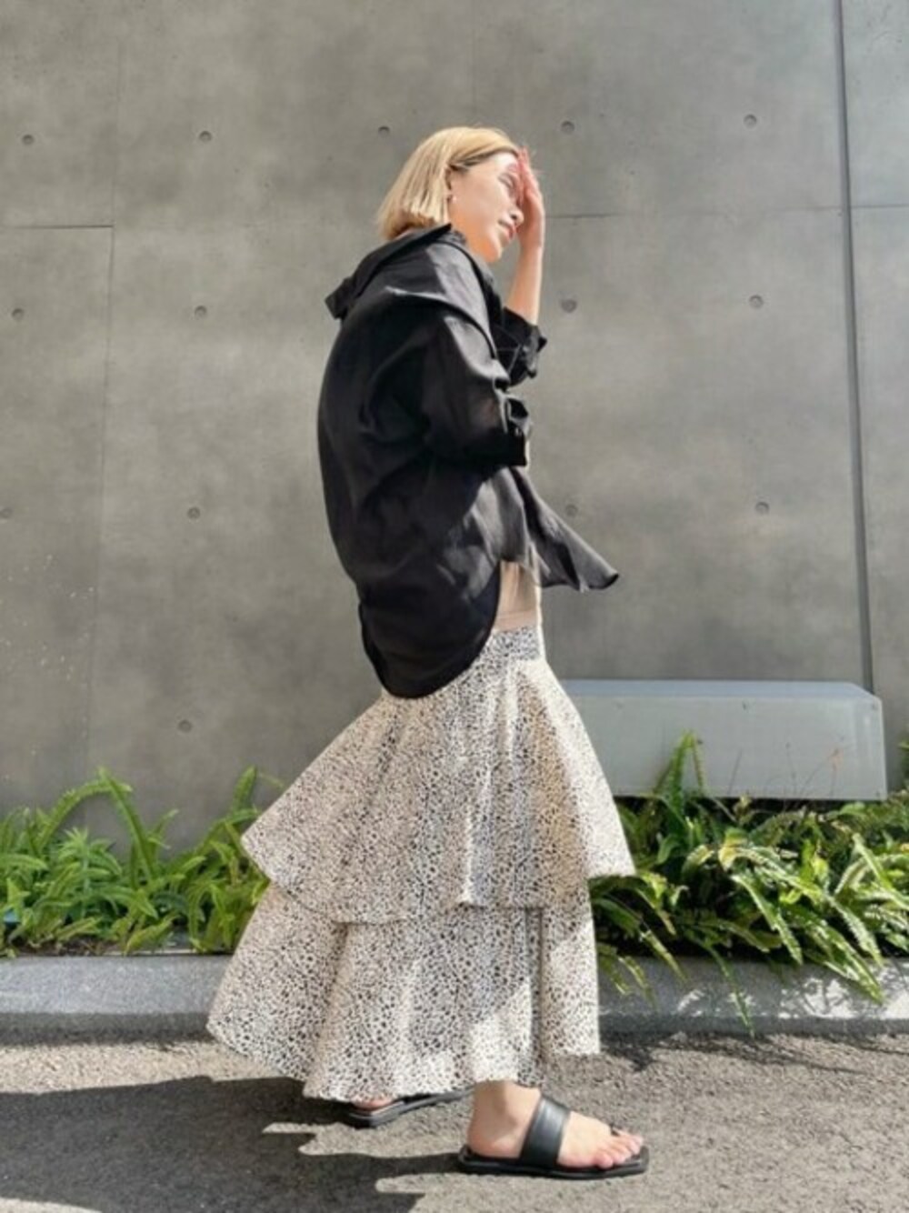 歩く度に揺れ感がポイントになる、ティアードスカートです☺︎シアー感のあるシャツとレイヤードしてみました◎透け感がかわいいですよね〜♡気温上がりましたが、軽い素材のシャツは冷房や日除け対策として使えるので、重宝しますよ♩