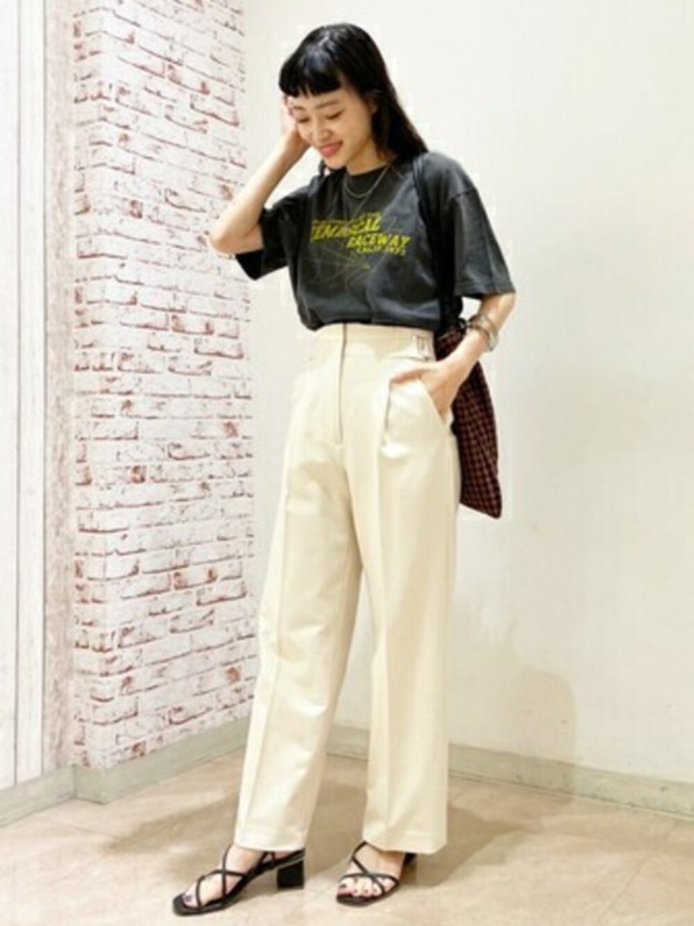 きれいめなオフホワイトのパンツはメンズライクなバンドTと合わせて大人のカジュアルスタイルに。ルーズなトップスもハイウエストなパンツで脚長効果抜群です⌾