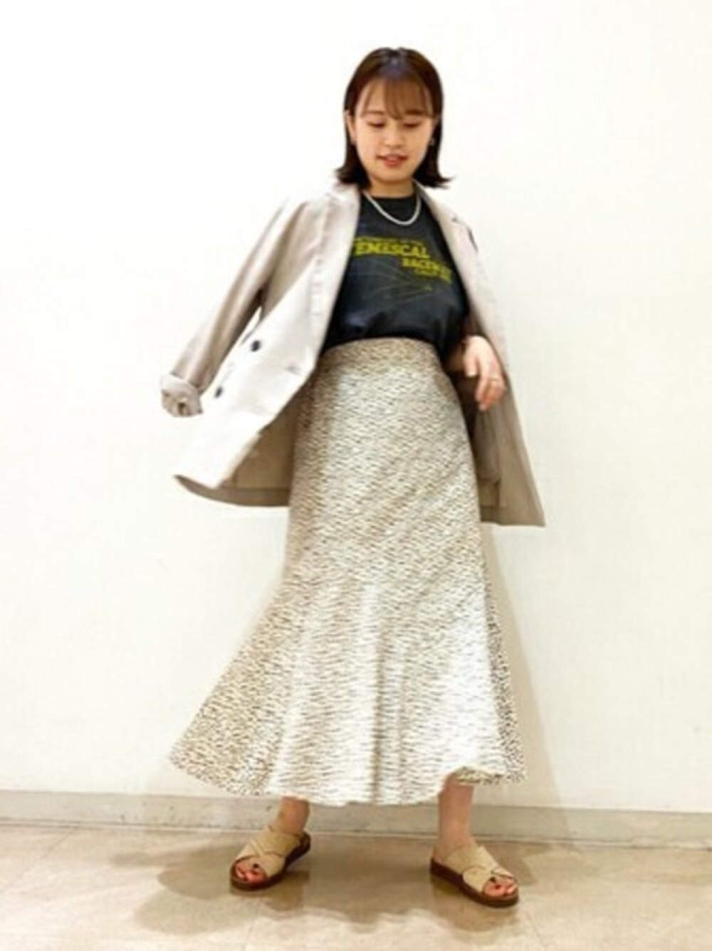 裾が柔らかく広がるトレンドのマーメイドスカート♡ 腰から膝上までストンと落ち感があり、履いた時もシルエットを綺麗に見せてくれます♪ カジュアルにTシャツと合わせて今年っぽく仕上げました◎