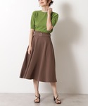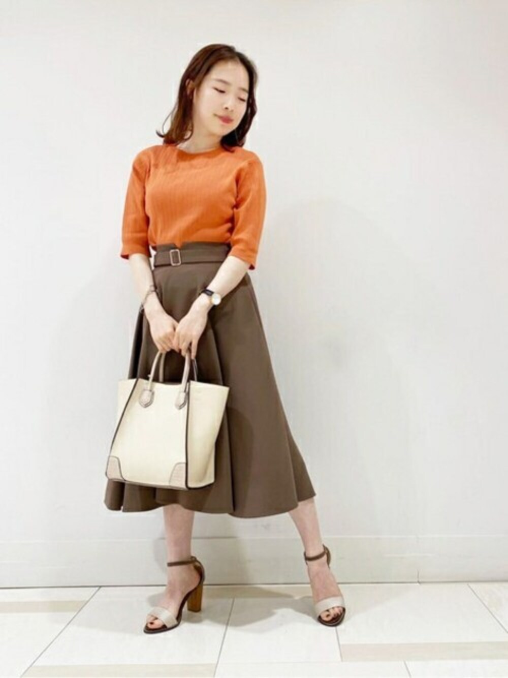 落ち着いたカラーリングのフレアスカートとオレンジニットを合わせて秋まで使えるコーデです♪ リブニットはサラッとした涼しげな素材です。5分袖なので二の腕も安心感があります。 フレアスカートはゴールドのベルトがポイントになりシンプルですがパッと目を引きます。 トップスをベーシックカラーにしても◎ 是非沢山着回しをしてみてください♪