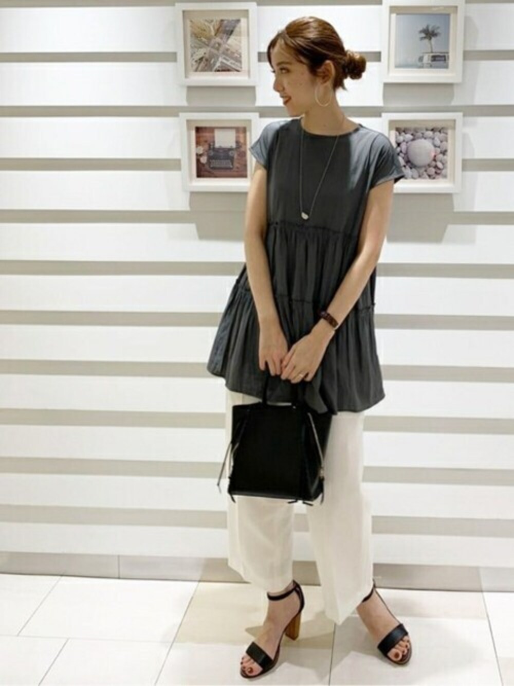 パウダーサテン素材なので夏でもサラッと着心地もよく、今からの時期にぴったりです。 二の腕のカバー出来る袖丈とヒップも隠れる着丈で安心感があり、 ティアードのデザインが今年らしい一枚で主役になれるアイテムです! N.で人気のジプシーサップパンツと合わせて大人カジュアルなコーディネートにしてみました♪