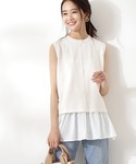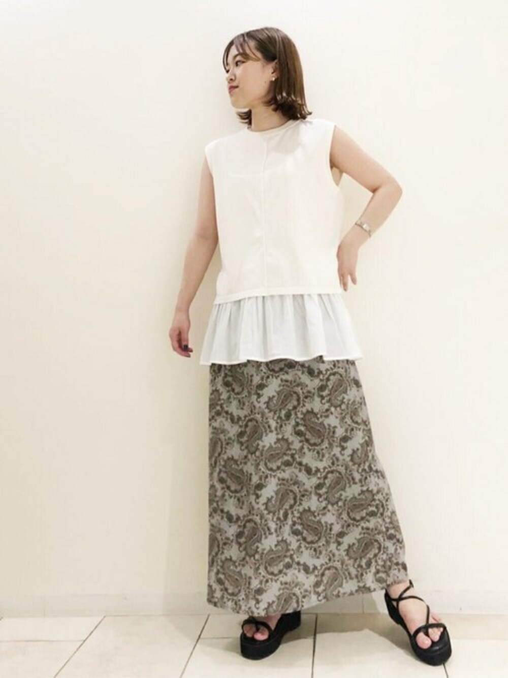 一枚でレイヤードスタイルが完成するノースリーブニット。私はアクセントにグリーンのペイズリー柄のスカートと合わせて、大人可愛く着てみました♡
