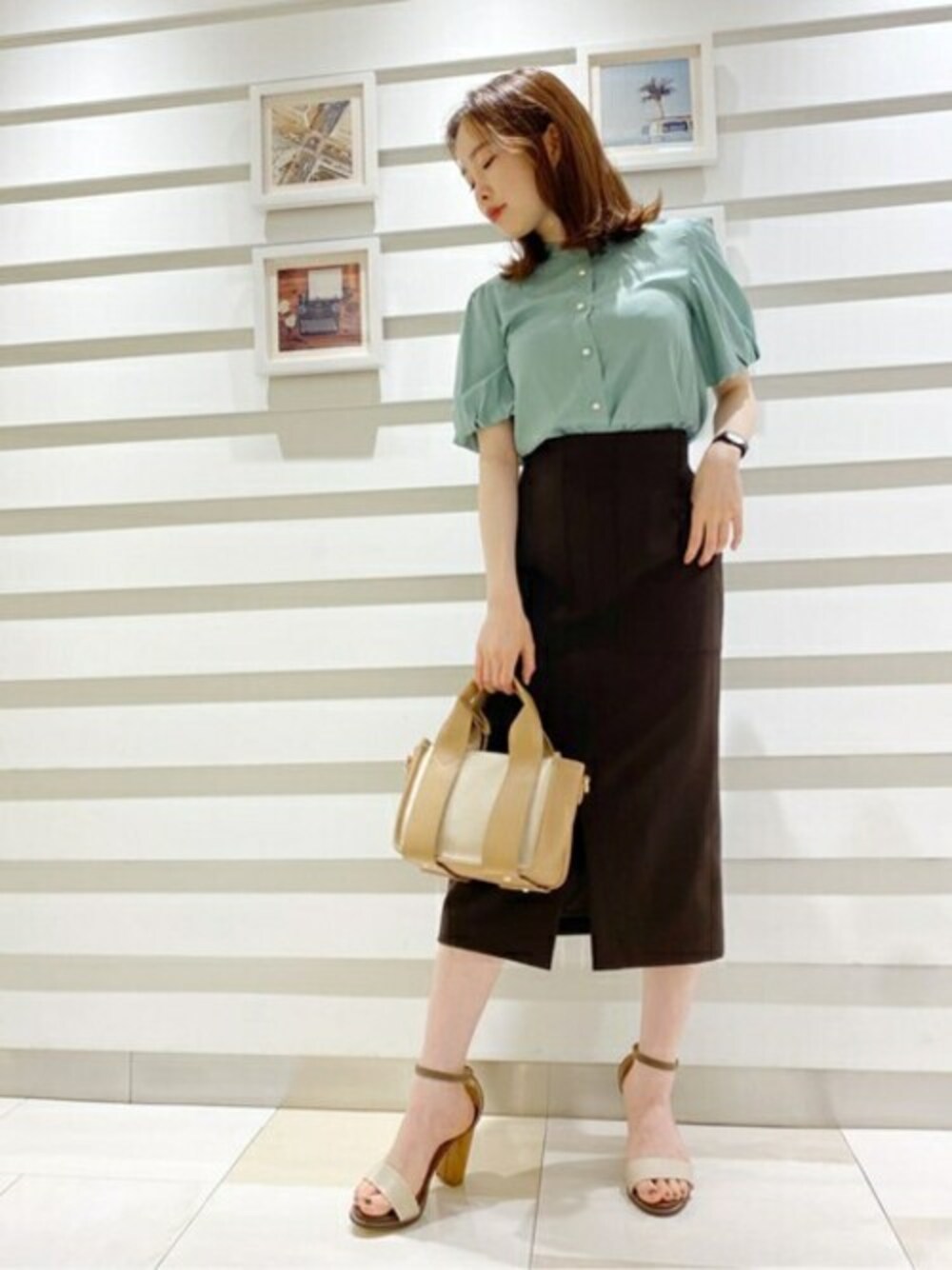上品なパールボタンが華やかな印象に。ベーシックカラーのボトムスと合わせると◎身頃もゆとりがありラインも拾いづらいので楽にお召し頂けます。 タイトスカートも後ろにゴムがあるので、お腹周りも窮屈感なく履いて頂けます。ブラウンカラーで 秋まで使えます♪ミントグリーン×ブラウンで雰囲気を変えてみてはいかがでしょうか。