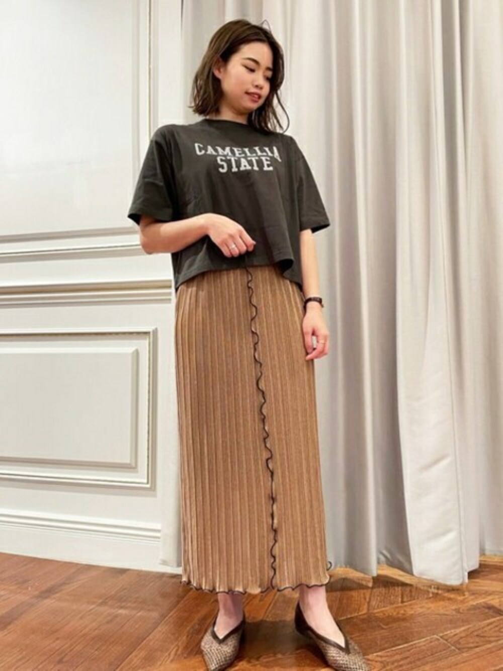 【POINT】カットプリーツスカートを主役にした大人カジュアルコーデ♪タイトスカートですが、後ろにスリットが入っていたり、伸縮性のある柔らかい生地でとても動きやすいです◎ 【年齢:30代前半/身長162cm/パーソナルカラー:イエベスプリング/普段Mサイズ 】