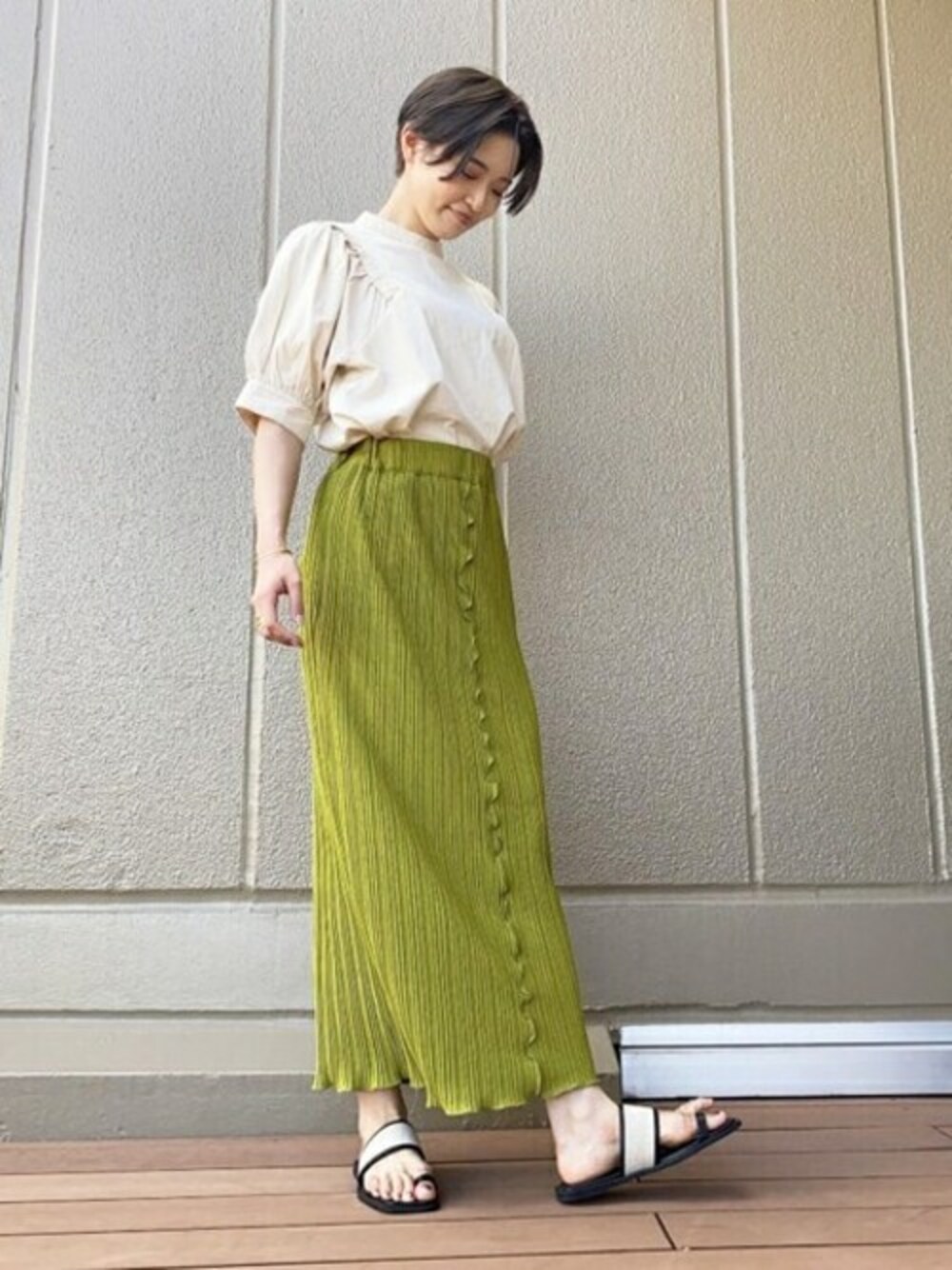 タック切り替えのボリュームスリーブなので、身頃はスッキリ着ることができます! スカートは体のラインを拾いすぎないのが嬉しいポイントです◎ チノのような素材のトップスと夏らしい素材のスカートで、ヴィンテージライクなスタイリングに仕上げました!